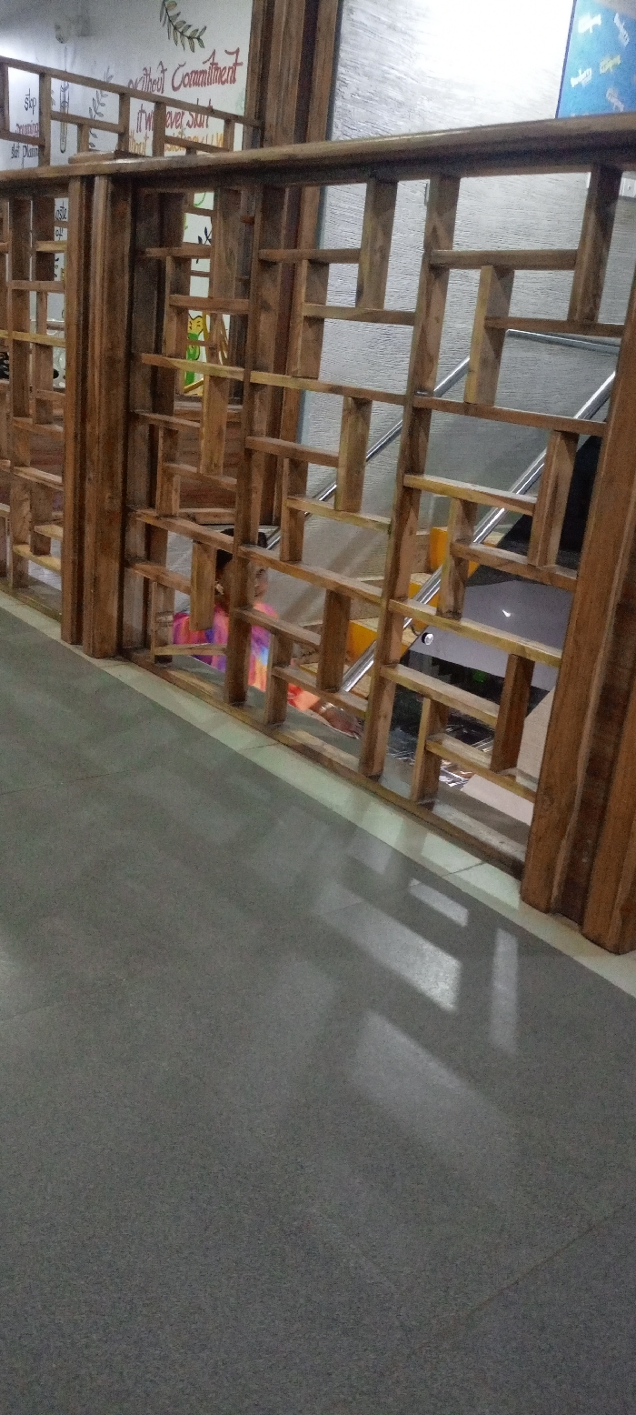 An indoor space featuring a dark grey floor. A wooden latticework structure acts as a partition, with horizontal and vertical beams forming small rectangular openings. In the background, stairs are visible, along with a small child wearing a colorful shirt peering through the latticework. Part of a wall with writing is also visible at the top left of the image.