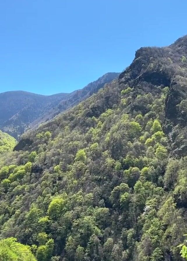 landscape of a lush green valley situated between mountains under a clear blue sky. The valley is densely covered with trees displaying fresh spring foliage, their leaves a vibrant light green. The mountains in the background are also wooded, but with a darker, more established green. The camera slowly pans from right to left, revealing more of the valley and the undulating mountain ranges beyond. In the foreground to the left of the frame, a tree with budding leaves is visible. No people or animals are visible.