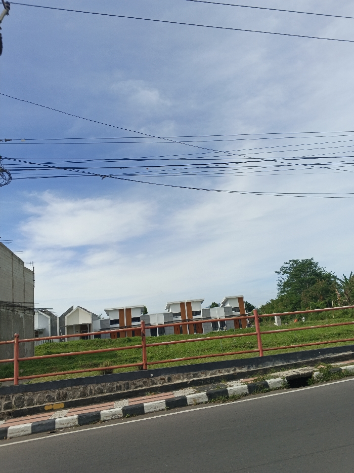 A low-angle shot shows a street leading to a row of houses beyond a grassy incline and orange railings. The houses are modern, with white roofs and brown accents. Power lines crisscross the bright blue sky dotted with clouds. A gray building stands on the left edge, and trees are visible on the right. The roadside has a black and white curb. The asphalt road takes up the bottom of the frame.