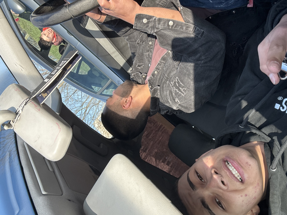 The image captures a daylight scene inside a vehicle in Oryahovo, Bulgaria, depicting an interaction between three young males across two cars