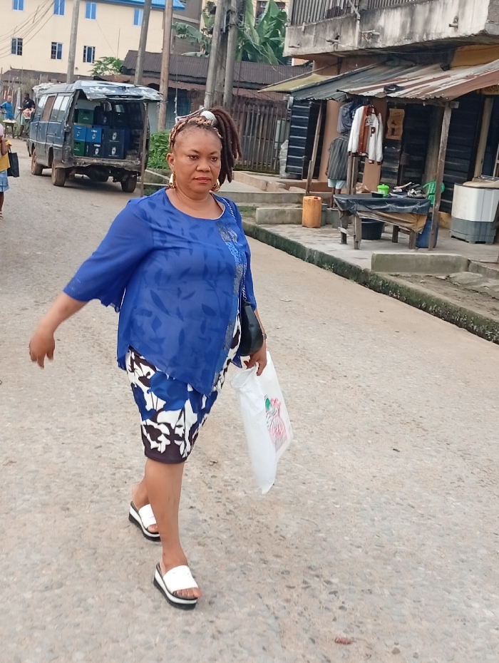 An adult woman with dreadlocks walks down a street. She wears a blue shirt, a patterned skirt, and white platform sandals. She carries a white plastic bag in one hand and a black purse over her shoulder. A van sits on the street behind her. A store with clothes hanging in the entrance is to the right. Overhead power lines are visible.