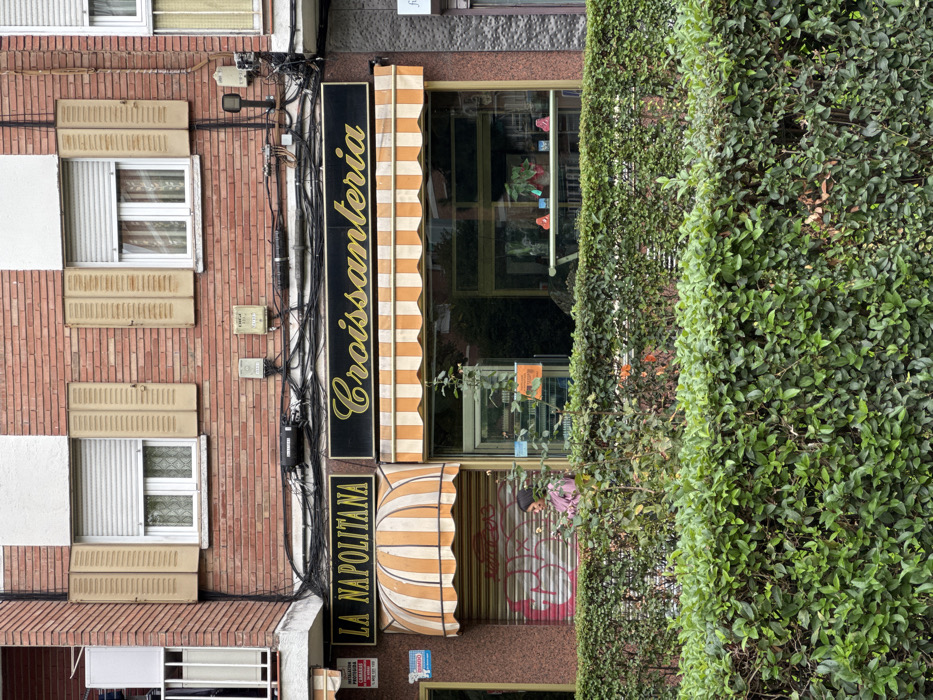 The image displays the facade of a building located at C. de Marcelino Camacho, 42, 28028 Madrid, Spain. The upper section is composed of red brick with intermittent white sections, featuring two windows with closed white roller shutters and open beige louvered wooden shutters. A dense cluster of black electrical wiring and utility boxes is mounted below the upper windows. At street level, two commercial establishments are visible. On the left, a portion of a shop labeled "LA NAPOLITANA" with gold lettering on a black background is seen above a semi-circular orange and off-white striped awning. This awning covers a metal roller shutter that is tagged with pink graffiti. To the right, a shop named "Croissanteria," also with gold lettering on black, features a rectangular orange and off-white striped awning over a large glass display window. Inside the "Croissanteria," a small plant and several small, colorful decorative items are visible on a lower shelf or counter. A glass entrance door is positioned on the left side of this storefront. A single individual, wearing a light pink or purple top, is partially visible in profile within the area of the left shop's closed shutter, appearing to look down. The foreground is dominated by a substantial, well-maintained green hedge that extends across the lower portion of the image, partially obscuring the shops' lower sections and the street level.