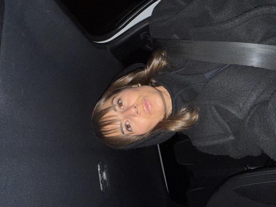 A woman with brown hair and bangs is seated in a car, wearing a black coat and a seatbelt. She is looking at the camera. The car interior is dark, with the door panel visible on the left and part of the seat on the bottom right. A window is also visible.