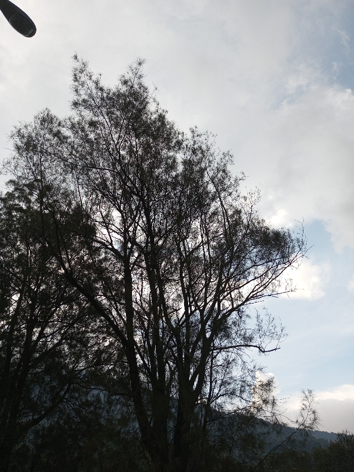 The scene, located in Ambositra, Madagascar, depicts a predominantly natural landscape under an overcast sky. The foreground is dominated by the silhouetted canopy of multiple trees, characterized by a dense network of dark branches and fine, dark foliage. The trees obscure the lower horizon. The sky, brighter than the foreground, displays extensive grey and white cloud cover, with a patch of light blue sky visible in the upper right quadrant. A dark, elongated object, consistent with a streetlamp head, is partially visible at the extreme top-left. Vague outlines of distant, dark hills or mountains are discernible below the tree line in the lower background. No human figures or activities are present.