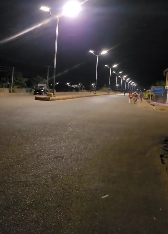 straight, empty road at night, illuminated by evenly spaced streetlights. Three people walk towards the camera in the distance. A single vehicle is parked on the side of the road. The road surface appears to be asphalt. The environment seems urban, with sparse buildings visible along the roadside.