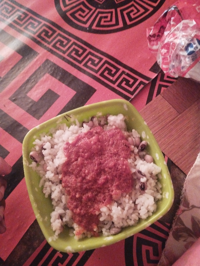 - "The scene, located in Unguwan Rimi, Nigeria, displays a light green, square-shaped bowl filled with food, positioned on a red surface featuring a repeating black Greek key pattern" by FM-eRG922, licensed under CC BY 4.0