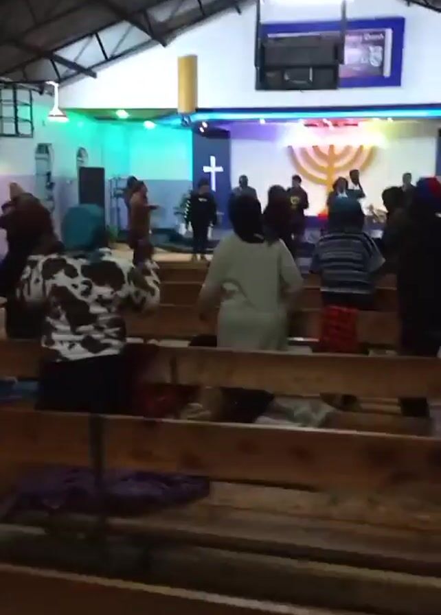 Inside a church, a group of people is seen from behind, facing the altar. The church has rows of wooden pews, and people are standing and moving around. The altar area is decorated with neon lights, crosses, and a menorah-like object. A screen hangs above the altar. People are wearing various clothes, including a yellow shirt, a red coat, and a black and white jacket. The room is lit with fluorescent lighting.
