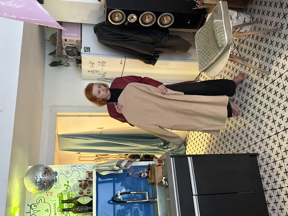The image captures an indoor scene within a lived-in apartment or studio, consistent with residences found in Tel-Aviv, Israel. The floor is covered in white tiles with a repeating black geometric star-like pattern. A single individual, a female with short, wavy reddish-orange hair, is positioned near the center of the frame. She is barefoot and wears a black long-sleeved top, black wide-leg trousers, and a long, open dark red jacket. She holds a light beige/tan long coat on a black hanger, suspended in front of her body, and appears to be looking down at it or just past it. To the left, a kitchenette area features a dark grey countertop with an integrated stainless steel sink and a single-handle faucet. On the counter are a pack of cigarettes (Marlboro brand), a lighter, a small wooden tray, a red and white strawberry-patterned cup, and a blue bottle of Sano brand dish soap. A blue tiled splashback rises above the counter, leading to a shelf holding two dark bottles, a clear glass carafe containing red liquid and strawberries, and a small glass with a matching strawberry design. The wall above the shelf is light green/yellow and covered with white marker drawings, including cartoon faces and the text "2023." A reflective disco ball hangs from the ceiling in this area. Dark grey/black cabinetry with silver horizontal handles is situated beneath the countertop. In the background, a doorway is partially obscured by a light blue/green fabric curtain, revealing a portion of a wooden clothes rack behind it. To the right of the individual, a white refrigerator, decorated with magnets, stands adjacent to a tall black speaker featuring multiple drivers. Several dark jackets are draped over an unseen object next to the refrigerator and speaker. To the far right, a small, round white table with three light wooden legs supports a light green ribbed pet bed or mat. A partially visible white plastic bag displaying "flying Tiger" text is located beneath the table. Above the refrigerator and speaker, a shelf holds potted plants, a pink microwave, and pink plastic decorations or streamers hang from the ceiling.