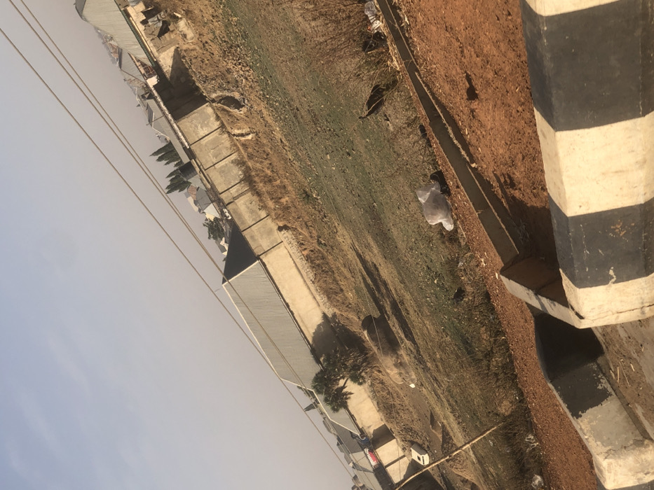 This image captures an outdoor scene in Hanwa, Nigeria, under a hazy, light-blue sky, viewed from an oblique angle. In the immediate foreground, a black and white striped concrete barrier or curb extends diagonally across the lower portion of the frame. Adjacent to this barrier, a concrete drainage channel runs parallel to it, transitioning into reddish-brown soil. The midground features a sloping, uncultivated area characterized by exposed reddish-brown soil and sparse patches of dry, light-green and brown vegetation. Scattered debris is visible, including a prominent white plastic bag near the center-right and other dark, unidentifiable objects. Two dark-feathered birds, appearing to be domestic fowl, are present; one is discernible standing in a patch of dry grass on the right side of the midground. Further up the slope, a large, irregularly shaped mound of brown material, possibly earth or organic matter, casts a distinct shadow. To the far left, partially obscured, a white vehicle, resembling a car, is visible at the base of a wall. A lean, light-colored utility pole or post stands vertically on the left. The background is defined by a long, light-colored concrete perimeter wall. Behind this wall, several single-story buildings with corrugated metal roofs, varying in shades of grey and tan, are visible. Clusters of trees, including palm-like varieties and slender evergreens, are interspersed among the structures. A black water tank on a stand is visible above one of the buildings on the upper right. Multiple parallel utility lines, possibly power or communication, traverse the sky diagonally across the upper right quadrant of the image.