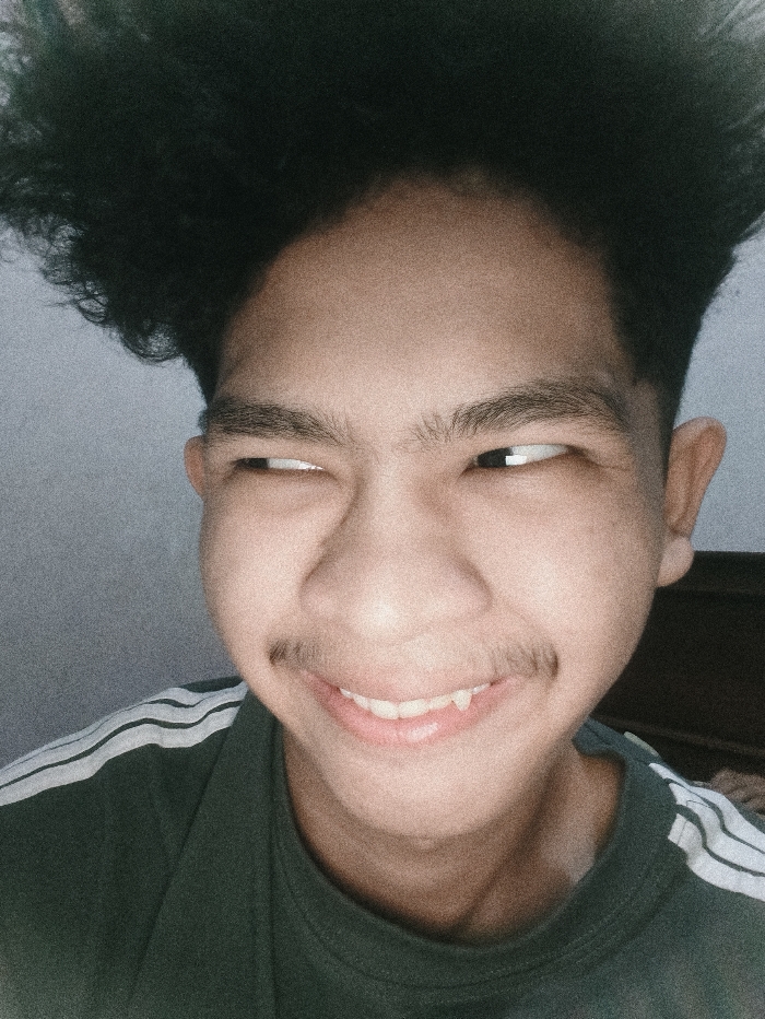 A close-up portrait depicts a young adult male, likely of Southeast Asian descent, positioned centrally in the frame. His dark, voluminous hair is styled upwards, with faded sides. He wears a dark green t-shirt featuring two horizontal white stripes on each shoulder. His face exhibits a playful or mischievous expression, with both dark eyes gazing towards the viewer's left. A thin mustache is present above his upper lip. He displays a wide smile, revealing his upper teeth, including prominent canines. The background consists of a plain, light-colored wall, with a dark, indistinct object partially visible on the right side behind his head, possibly a piece of furniture. The scene is indoors. No specific identifying features within the image indicate a precise location in the city of Lhokseumawe, Indonesia.