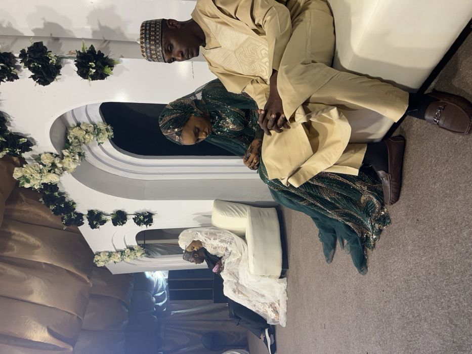 Three individuals are seated in an indoor setting. The first couple, positioned at the top of the image, are formally dressed in traditional attire, the man in beige and the woman in green, and they hold hands. A second woman, wearing a white dress and hijab, is seated at the bottom of the image. They sit in a modern white backdrop decorated with black and white floral arrangements.