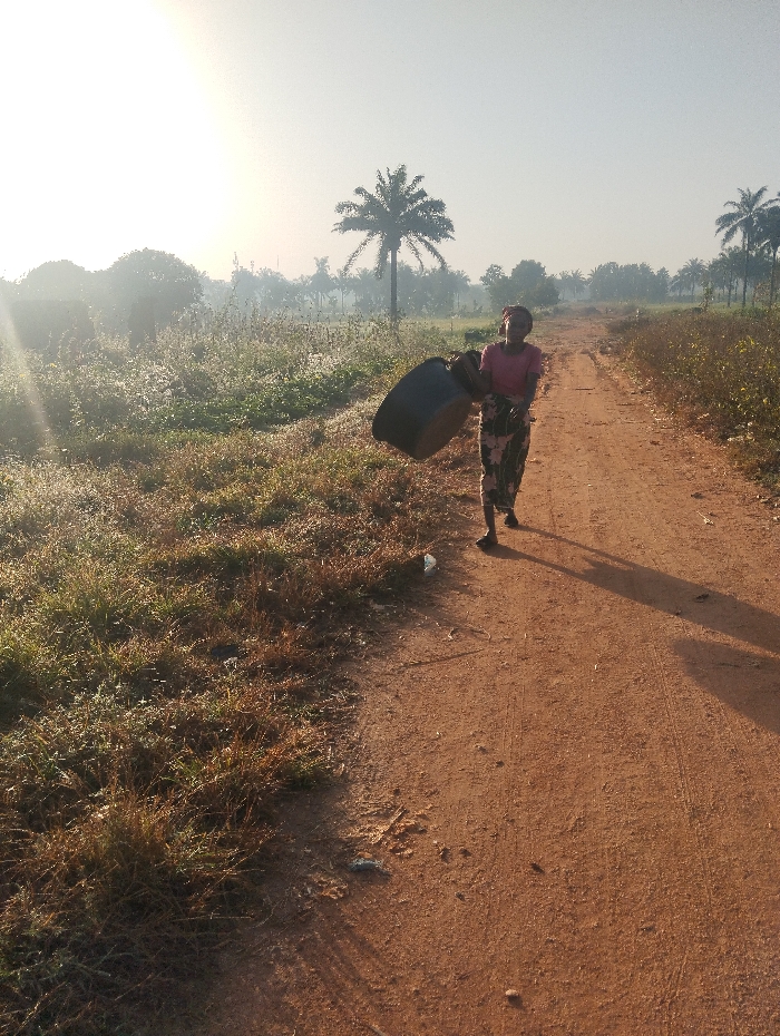 The image depicts an outdoor scene in Unguwan Rimi, Nigeria, during early morning