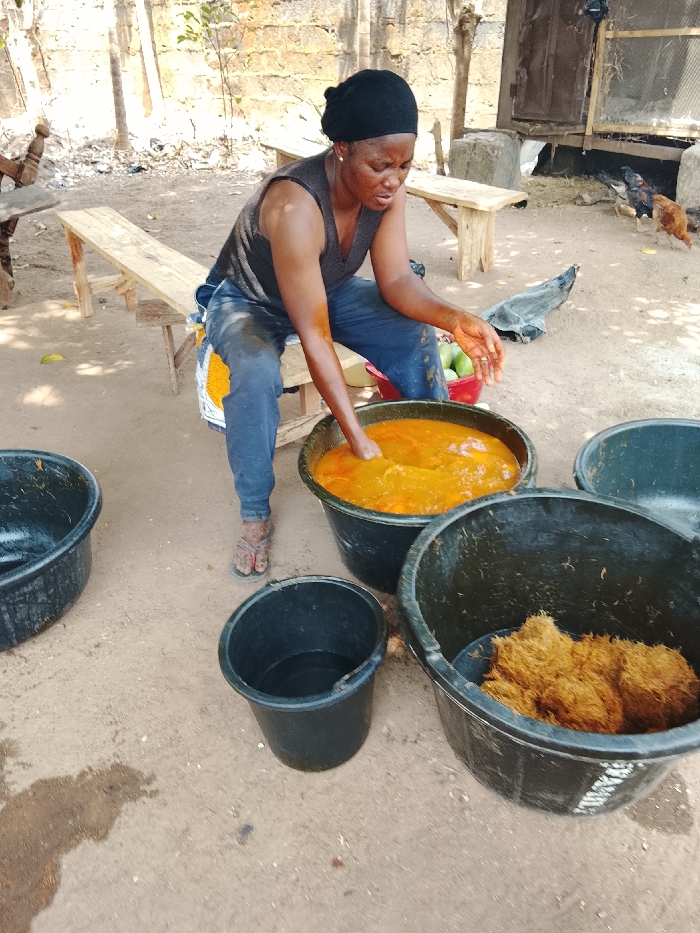 The image depicts an outdoor scene in Akwanga, Nigeria, featuring an adult female engaged in processing activities