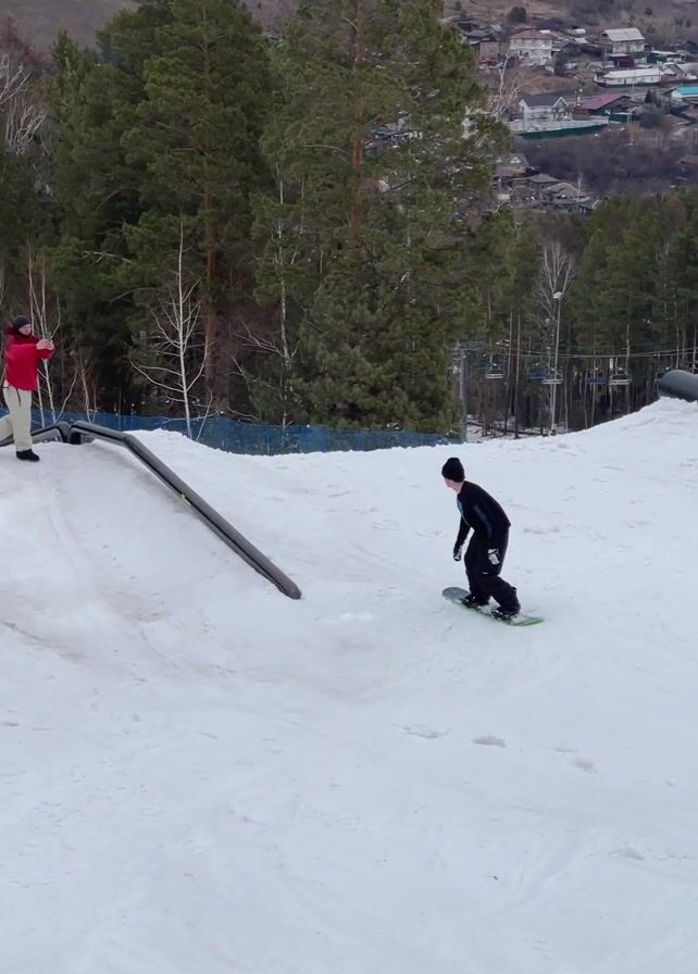 A young snowboarder wearing a black outfit and beanie rides down a snowy slope toward a set of two parallel, metal rails. He successfully rides on the first rail and dismounts onto the snow. Another person wearing a red jacket and tan pants stands near the rails and films the snowboarder’s trick. The terrain includes bare trees and green evergreens. In the background, a residential neighborhood is visible against a hillside.