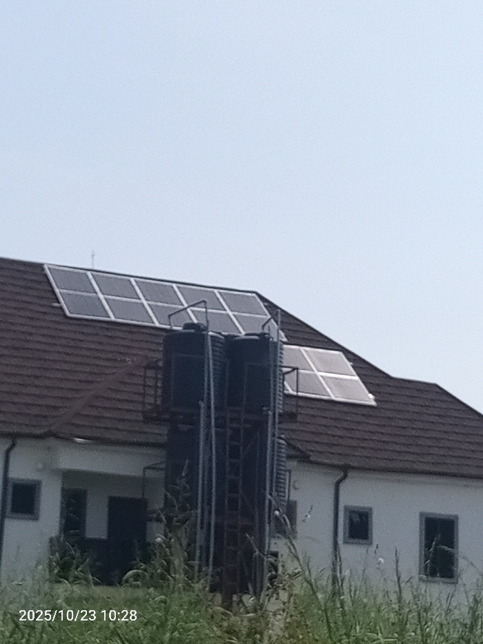 The image displays an exterior view of a building in Enugu, Nigeria, under a clear, pale blue sky, with a timestamp of 2025/10/23 10:28 in the lower left corner. The building has white exterior walls and a dark brown tiled roof. On the roof, two distinct arrays of solar panels are visible: a larger array of at least eight panels (configured in two rows of four) on the left section, and a smaller array of at least four panels on a lower roof section to the right. In the mid-ground, positioned directly in front of the building, a tall, dark metal support structure holds two large, dark-colored cylindrical water tanks. This structure includes what appears to be an integrated ladder or set of access steps. The foreground is dominated by dense, tall green and dried grasses, which partially obscure the lower portion of the building and the water tank support structure. No individuals are visible within the scene.