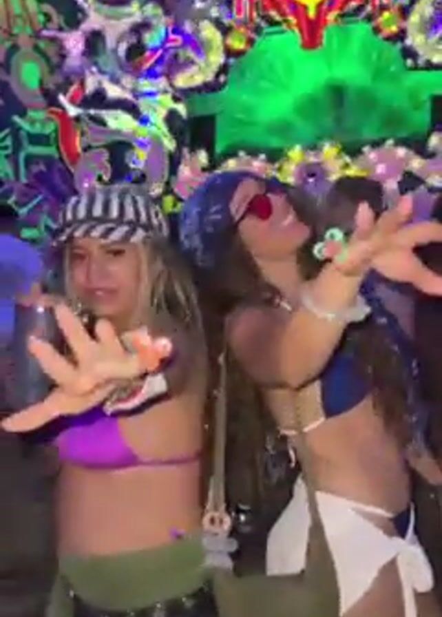 Two women are dancing in front of a neon-lit stage at what appears to be an outdoor music festival