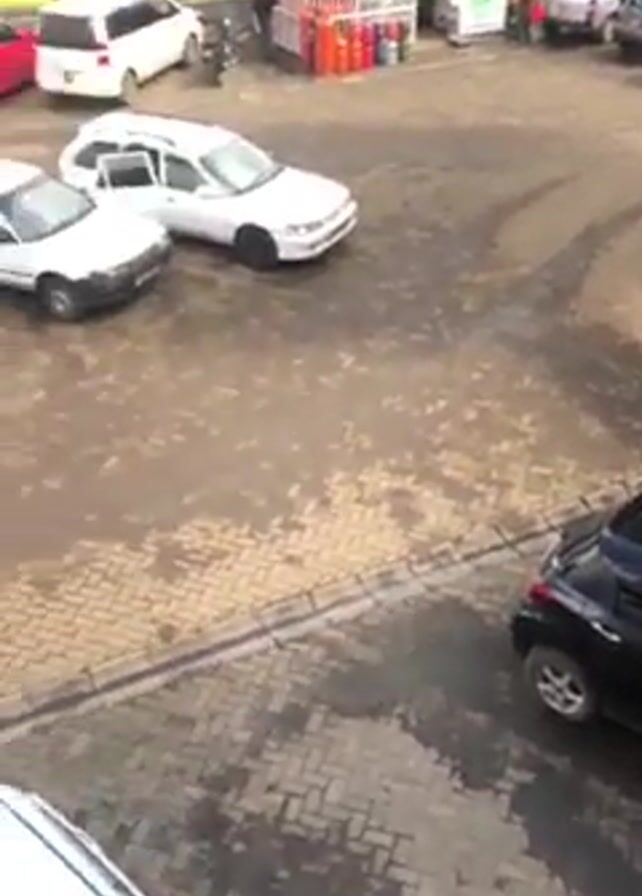 The video, recorded from an elevated position, shows a busy parking area with numerous vehicles of varying makes, models, and colors. These include cars, SUVs, and a few three-wheeled vehicles known as Tuk-Tuks. Several people are seen walking around and interacting within the parking lot, which appears to be part of or adjacent to a gas station, as indicated by the branded signage. The parking surface is made of brick, which appears wet, suggesting it may have rained recently or is being cleaned. The background includes trees and buildings, suggesting a suburban or urban environment. The overall scene is indicative of a busy commercial area with vehicular and pedestrian traffic.