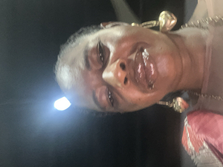 The image displays a close-up, low-angle portrait of an adult individual with dark skin, centered against an entirely dark, undifferentiated background