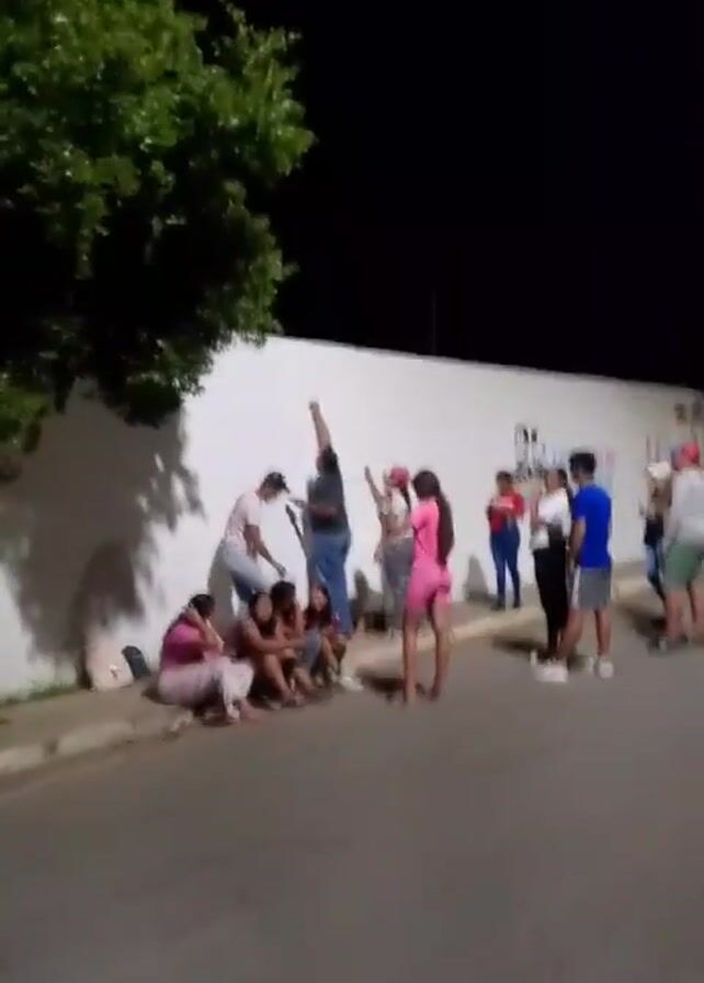 At night, a group of about a dozen people stand on the sidewalk next to a street, in front of a long white wall with painted images. Some are sitting on the curb. A tall man is standing and painting something on the wall with a brush or stick. A few other people are watching or talking. The image is a bit blurry and not very high definition. There is a tree to the left. The sky is black, and there is a street light in the distance to the right. The camera is still.