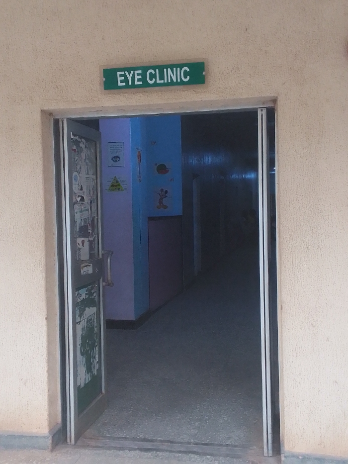 A doorway with a green sign above that reads "EYE CLINIC" in white lettering. The door is open, revealing a hallway with light blue walls, a light purple wall on the left, a dark grey floor, and a dark corridor leading further down the hall. The corridor is dark and there are no visible people or objects in the hallway. The hallway has several unidentified images on the walls, including a cartoon eye, a watermelon, and a cartoon silhouette of a person. The door frame is a dark grey color, and the doorway is framed by a cream-colored wall with visible textural irregularities. The image's location is an eye clinic located in the city of Gwarinpa, Abuja, Nigeria, at the coordinates provided (latitude: 9.907, longitude: 8.96).