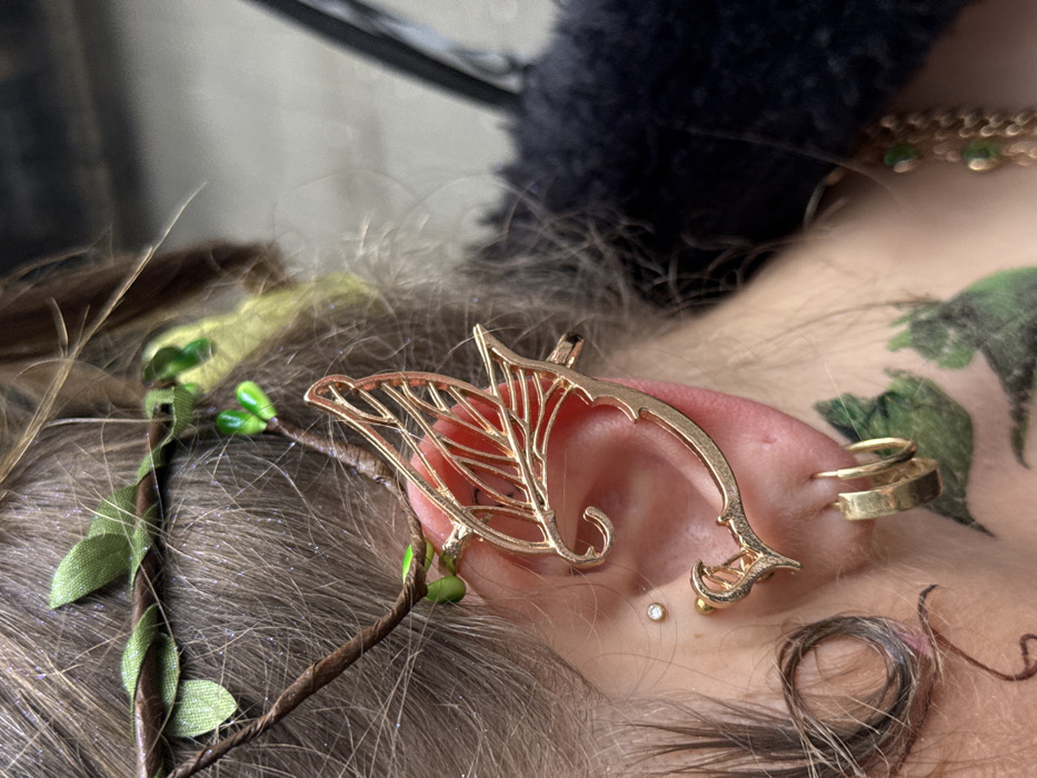 The image presents a detailed close-up of the right side of a person's head, specifically their ear, hair, and a portion of the neck, located in the city of Cologne, Germany. The subject's hair is light brown, finely textured, and appears to contain subtle shimmering particles. A decorative hair accessory, crafted to resemble a vine with brown wrapping, small green fabric leaves, and green spherical beads, is intertwined within the hair above the ear. The ear is prominently adorned with a large, gold-colored ear cuff featuring an intricate openwork design suggestive of leaves or wings, which clamps onto the outer helix and antihelix. The ear also displays a small, clear spherical stud piercing in the upper cartilage and two gold-toned hoop earrings in the earlobe. Behind the ear, on the neck, a green tattoo depicting a stylized botanical or natural pattern is visible. The subject is wearing a dark, textured garment, possibly a faux fur or woolen coat, partially visible on the right side of the frame. A gold-colored chain with small green bead accents is also partially discernible on the far right, suggesting an additional accessory like a necklace. The background is softly blurred, providing minimal environmental context beyond the subject.