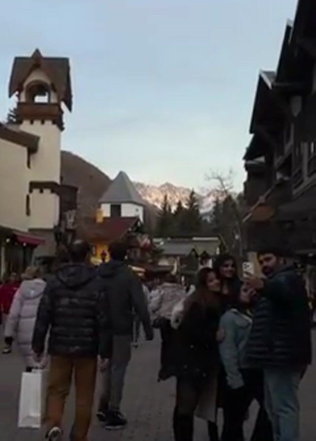 pedestrian street in what appears to be a European-style village or resort town. The street is paved with cobblestones and lined with buildings, some with traditional Alpine architecture, featuring gabled roofs and wooden details. A tall, light-colored tower with a bell or viewing platform stands on the left side of the street. In the background, snow-capped mountains are visible under a light-colored sky. Several people are walking along the street, and a small group of four people is taking a selfie with a smartphone. One man is holding the phone, and the other three are posing with him. Some people are carrying shopping bags. The overall atmosphere seems relaxed and touristy.