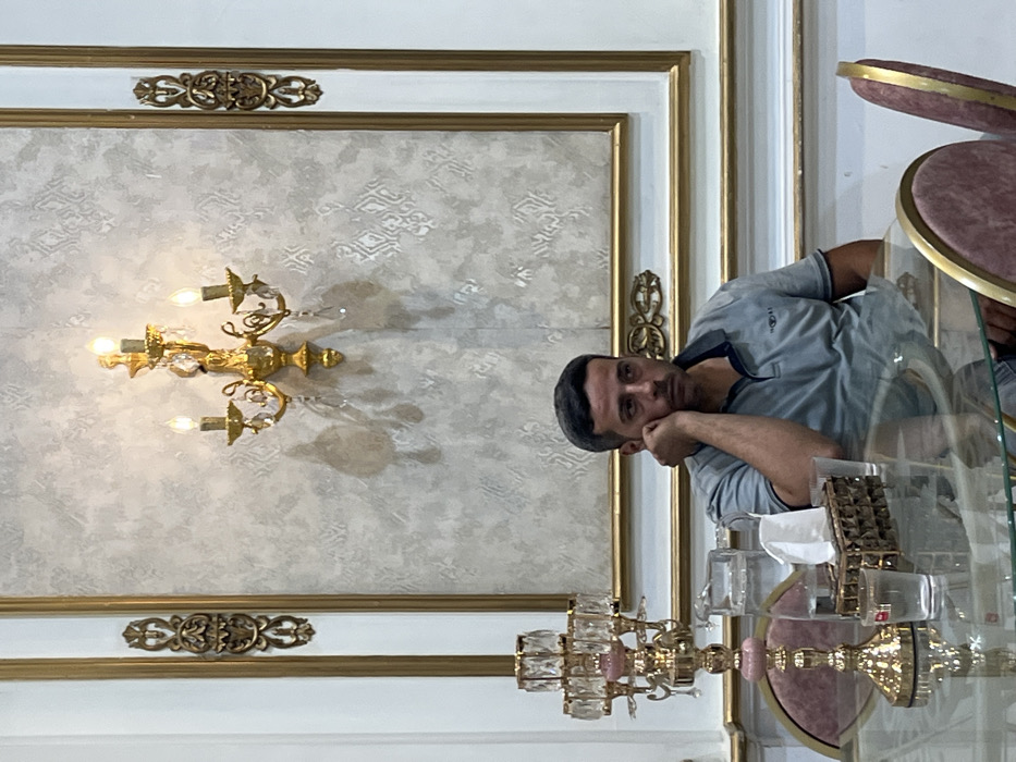 This image captures an indoor scene within the city of Babella, Syria, featuring an adult male seated at a glass-top table