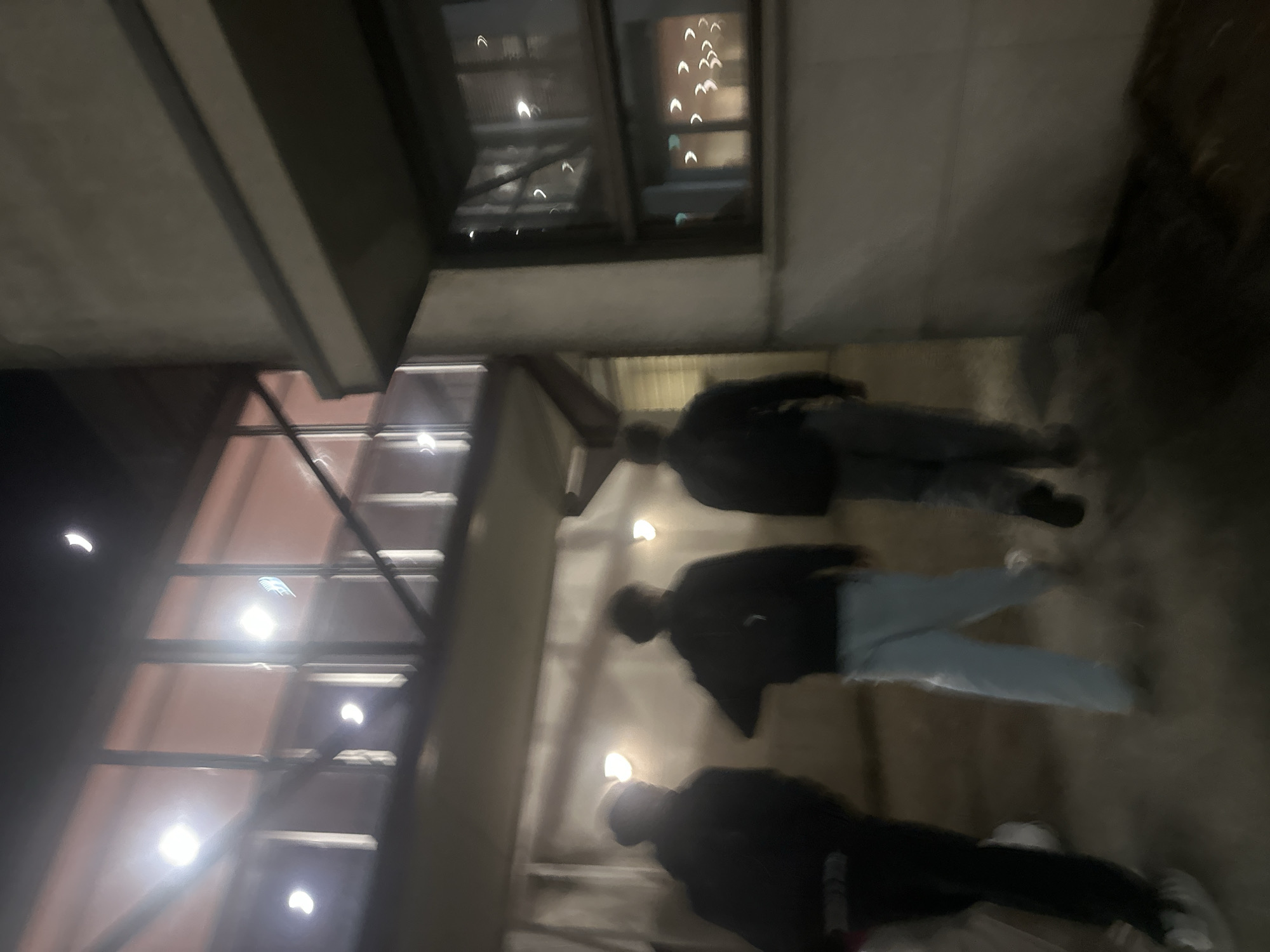 A low-light, urban scene at night in Guimarães, Portugal, depicts three blurred individuals walking away from the camera. The leftmost person wears dark attire and white shoes. The central individual is dressed in a dark top, light-colored pants, and white shoes. The person on the right wears dark clothing. They are moving across a dark, paved ground surface. The architectural background on the left consists of a building with a multi-paned glass facade reflecting several bright, crescent-shaped artificial lights. To the right, a plain, light-toned building wall features a rectangular window below an architectural overhang, also reflecting ambient light. The overall environment is dimly illuminated by artificial sources, with prominent light reflections.