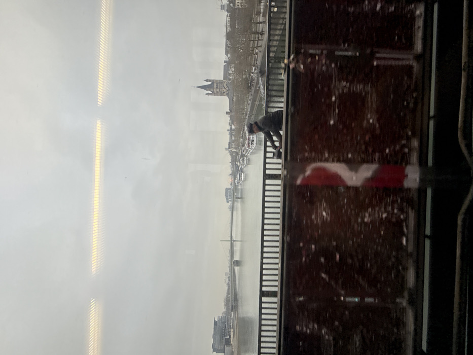 The image depicts an elevated view of the Rhine River in Cologne, Germany, looking south from the Hohenzollern Bridge. The sky is overcast and grey. In the immediate foreground, the lower portion of the frame is obscured by a dark, blurred, reddish-brown surface, consistent with the interior or structure of a moving vehicle or bridge. A vertical pole, red with a white spiral stripe, is visible on the right side of this foreground. Above this, a grey metal railing, characteristic of a bridge, spans the width of the image. On the bridge walkway, immediately beyond the railing, a single individual is observed cycling towards the right side of the frame. The person is wearing a dark jacket and a dark flat cap, riding a dark-colored bicycle. The Rhine River occupies the central mid-ground, appearing calm and grey. On the river's eastern bank (left side of the frame), multiple commercial passenger boats or ferries are docked alongside a promenade. Further upstream, a cable-stayed bridge, identifiable as the Severinsbrücke, spans the river in the distance. On the western bank (right side of the frame), the prominent Romanesque spire and tower of the Great Saint Martin Church are clearly visible, flanked by other urban buildings and bare deciduous trees along the riverfront. Buildings are also visible on the far bank (Deutz side) on the left.