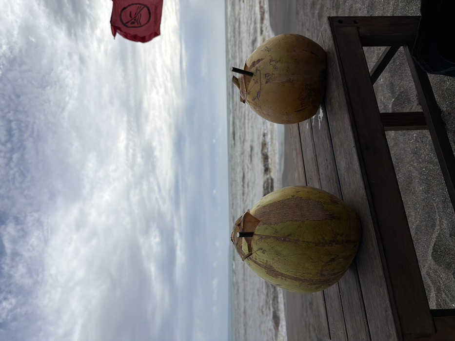 A coastal scene in Unknown, Indonesia, is depicted under an overcast sky. In the foreground, two whole coconuts, prepared for drinking with dark straws inserted into their opened tops, sit on a dark wooden table or bench. The coconut on the left is predominantly green with vertical brown striations, while the coconut on the right is a more uniform golden-brown. Below the wooden structure, dark grey or black sand of a beach is visible. The midground shows a body of water, identified as the ocean, with moderate waves breaking towards the shore. The background consists of a heavily overcast sky, filled with layered grey and white clouds. To the far right, a red warning flag, partially visible and fluttering, displays a white circular symbol depicting a person in water with a diagonal line through it, indicating "no swimming." No individuals are present in the frame.