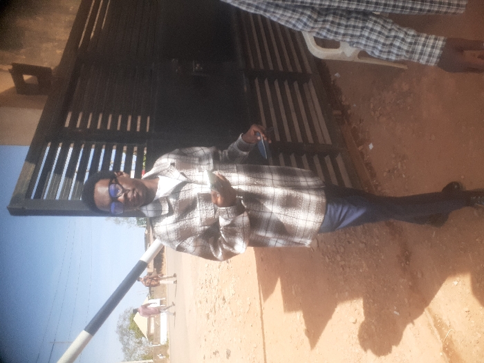 The image depicts an outdoor scene in Gura Top, Nigeria, under clear, sunny conditions. The ground consists of reddish-brown dirt. In the foreground, a male individual with dark skin, short dark curly hair, and dark-rimmed glasses stands, facing slightly right and looking towards his left. He is dressed in a white undershirt, a brown and white plaid long-sleeved button-up shirt, dark blue trousers, and dark dress shoes. He holds a dark-colored smartphone in his left hand and a dark rectangular object in his right hand. To his immediate right, the lower right arm and torso of another individual, wearing a light and dark plaid long-sleeved shirt, are partially visible, positioned next to a white plastic chair. Behind the main subject, a dark metal gate with horizontal slats is visible. To the left, a black and white striped boom barrier extends diagonally upwards from the left mid-ground. In the background, two male figures walk on an unpaved road, with distant buildings and trees under a clear blue sky. Overhead power lines are visible against the sky.