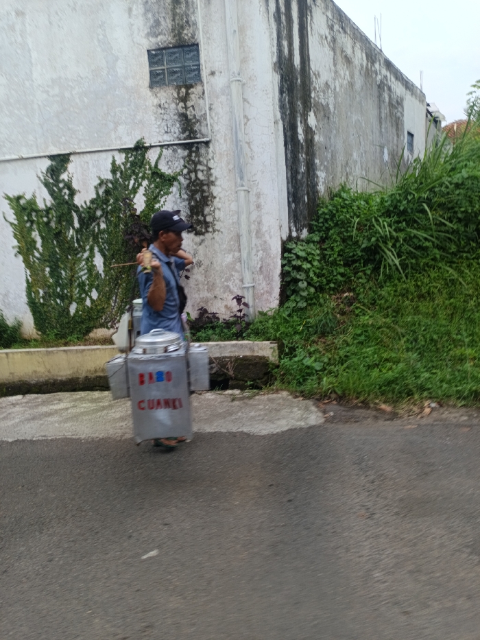 In Sindangasih, Indonesia, a male street vendor walks rightward on a paved asphalt road, carrying a metallic food cart via a wooden pole balanced across his shoulders