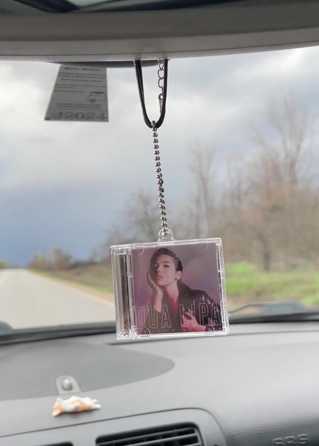 driver's perspective from inside a car, focused on a road ahead. A clear plastic CD case with a Dua Lipa album cover hangs from the rearview mirror. The dashboard of the car is visible, featuring air vents, hazard lights, and other controls. A small white object sits on the dashboard. Outside, the road stretches into the distance under a dramatically cloudy sky, with trees and sparse vegetation lining the sides. The car is moving.