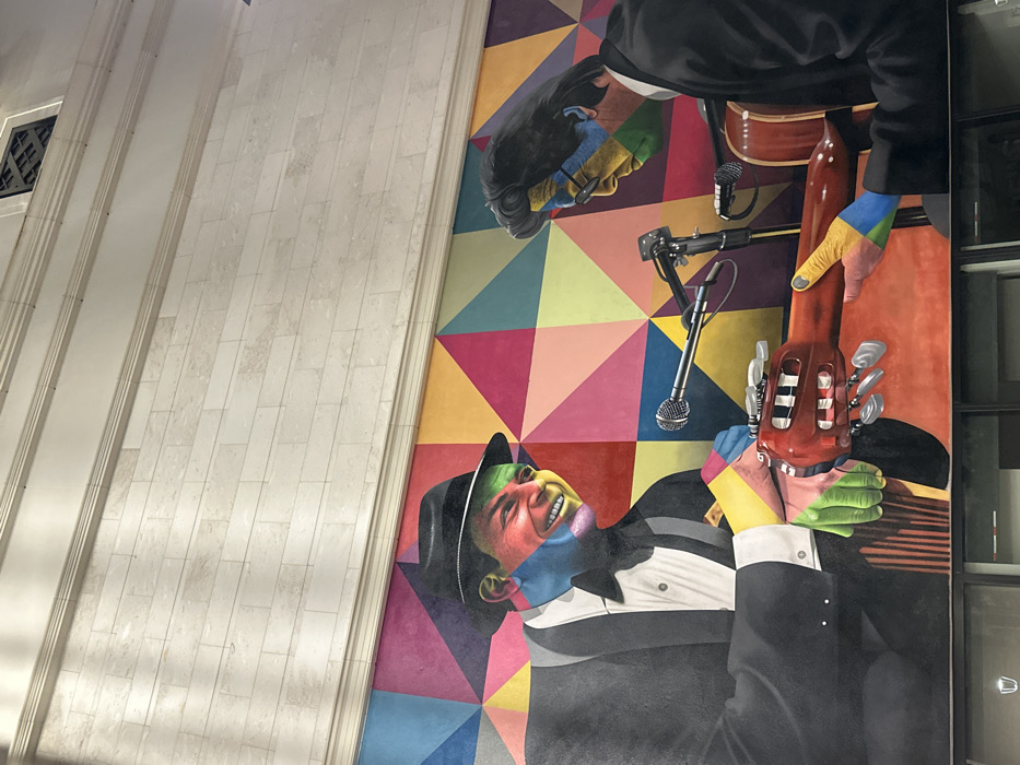 - "A large mural is depicted on a building wall in Coral Gables, United States, portraying two male musical figures against a background of brightly colored, interlocking geometric triangles" by FM-Iu0cr1, licensed under CC BY 4.0
