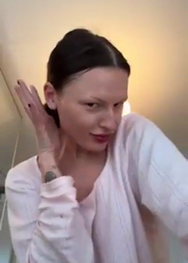 A woman is standing inside a room. She has dark hair pulled back in a small ponytail and red lipstick. She wears a light pink shirt with long sleeves. Her arms are raised to her face and she makes an exaggerated expression with her mouth open wide. The camera is angled upward. A ceiling light is visible in the background. A tattoo is visible on her arm. She glances away from the camera after she makes the expression.