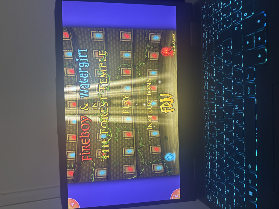 The scene depicts a dark-colored laptop computer positioned in Welshpool, United Kingdom. The laptop's keyboard is illuminated with a teal-blue backlight. The screen displays the title interface for a video game titled "Fireboy & Watergirl IN THE FOREST TEMPLE." The game title is rendered in red and blue text for the characters' names and green text for the temple setting, accompanied by vine imagery. The background of the game interface consists of a textured wall, possibly stone or brick, featuring multiple alcoves, some glowing red and others blue. Vertical beams of light are visible on this background. Below the title, the options "PLAY" and "INSTRUCTIONS" are presented in yellow text, with a "FRIV" logo beneath. The bottom left and right of the screen feature an iconic representation of "Watergirl" (blue) and "Fireboy" (red), respectively. A copyright notice, "© OSLO ALBET," is visible in the bottom right corner of the screen. The physical environment surrounding the laptop appears dimly lit.
