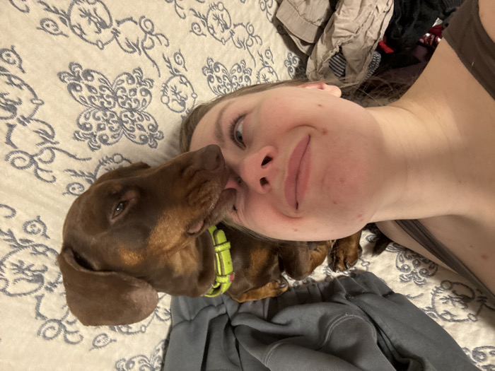 The image portrays an indoor scene, presumably within a private residence in Zelenogradskiy, Russia. A female individual with fair skin and light hair, wearing a dark brown strap garment, is positioned lying down, her head turned towards the viewer. She displays a closed-mouth smile. Adjacent to her head is a brown dachshund dog with a neon yellow collar. The dog's muzzle is in direct contact with the female's left cheek/chin area, with its tongue partially extended, indicating a licking action. Both subjects are resting on a light-colored bedding material adorned with a recurring blue and grey ornamental pattern. Disheveled clothing is visible in the upper right background, and grey fabric partially covers the lower body of the dog.