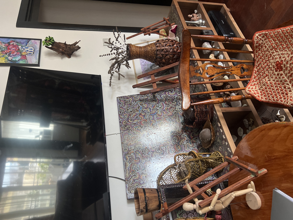 The scene is an interior space, specifically described as located in Bar, Montenegro. No individuals are present. The focal point is a large, wall-mounted, rectangular black television screen, reflecting an interior room with multiple vertical windows and bright ambient light. Below the television, a large, horizontally oriented abstract painting rests against a white wall, displaying intricate, colorful, and repetitive curvilinear patterns with a metallic sheen. To the left of the painting, a small wooden bucket with dark bands is positioned. Beneath the painting and bucket, a light-stained wooden console table with multiple open shelves is situated. On its surface, from left to right, are a miniature wicker chair, a small brown woven basket containing dark objects, a wooden bowl holding a round grey object (possibly a stone or decorative sphere), and several small wooden easels in varying orientations. A tall, woven wicker vase filled with dried, branched plants with seed pods stands centrally on the console. Below the vase, small decorative items, including smooth pebbles and small figurines, are visible on the shelves. On the white wall above the console table, to the right of the television, a framed artwork depicting a vibrant floral still life in a blue and white striped vase is mounted. Below this painting, a piece of gnarled, dark wood is affixed to the wall, featuring a small green artificial succulent. In the foreground, to the left, a portion of a round, polished wooden table is visible. On this table, a wooden artist's mannequin, articulated and posed in a seated position, rests against a small, folded wooden easel. To the right in the foreground, the back and seat of a dark wooden Windsor-style chair are present, upholstered with a crocheted cushion featuring a red and beige geometric pattern. The flooring consists of dark wood planks.