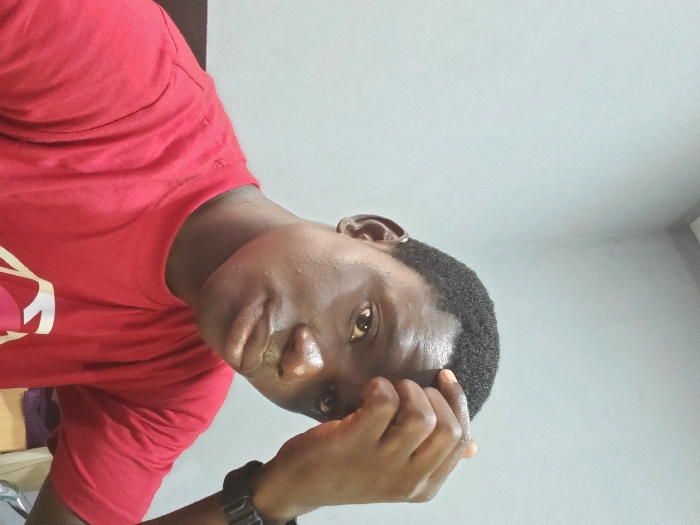 A close-up portrait features a young adult male with dark skin and short, dark, curly hair. He is wearing a red short-sleeved t-shirt with a faint graphic on the lower left and a dark-colored watch on his left wrist. His right hand is raised, with fingers gently touching his forehead near the hairline. The individual is looking directly at the camera with a neutral expression. The background is a plain, light gray wall, with a ceiling corner visible in the upper right, indicating an indoor setting. Blurry, indistinct objects, possibly furniture and fabric, are visible in the lower right background. The scene is located in the city of Lagos, Nigeria.