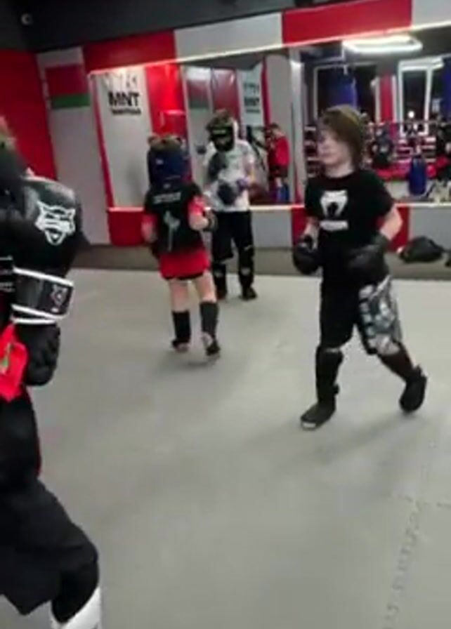 A group of children wearing protective head gear and boxing gloves practice martial arts in a gym. They are punching, kicking and moving around on the mats. One child is wearing white leg protectors. There is a large mirror on one wall. There is a banner for MNT Martine on another wall.
