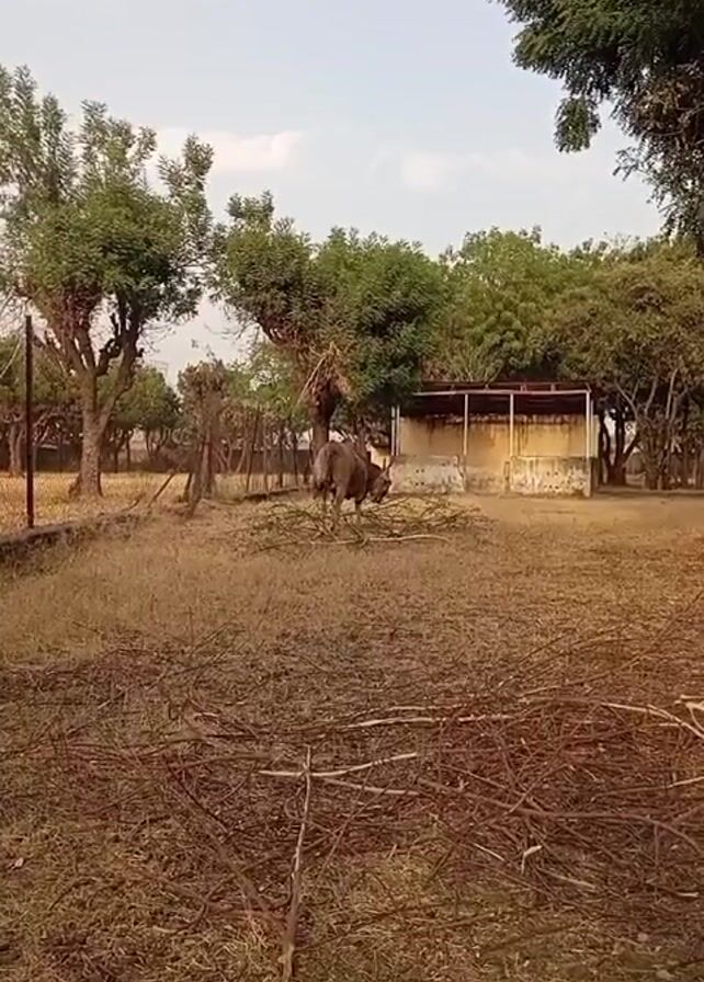 The video depicts an outdoor enclosure with a large, gray animal, possibly a nilgai or large antelope, standing in the center of the frame