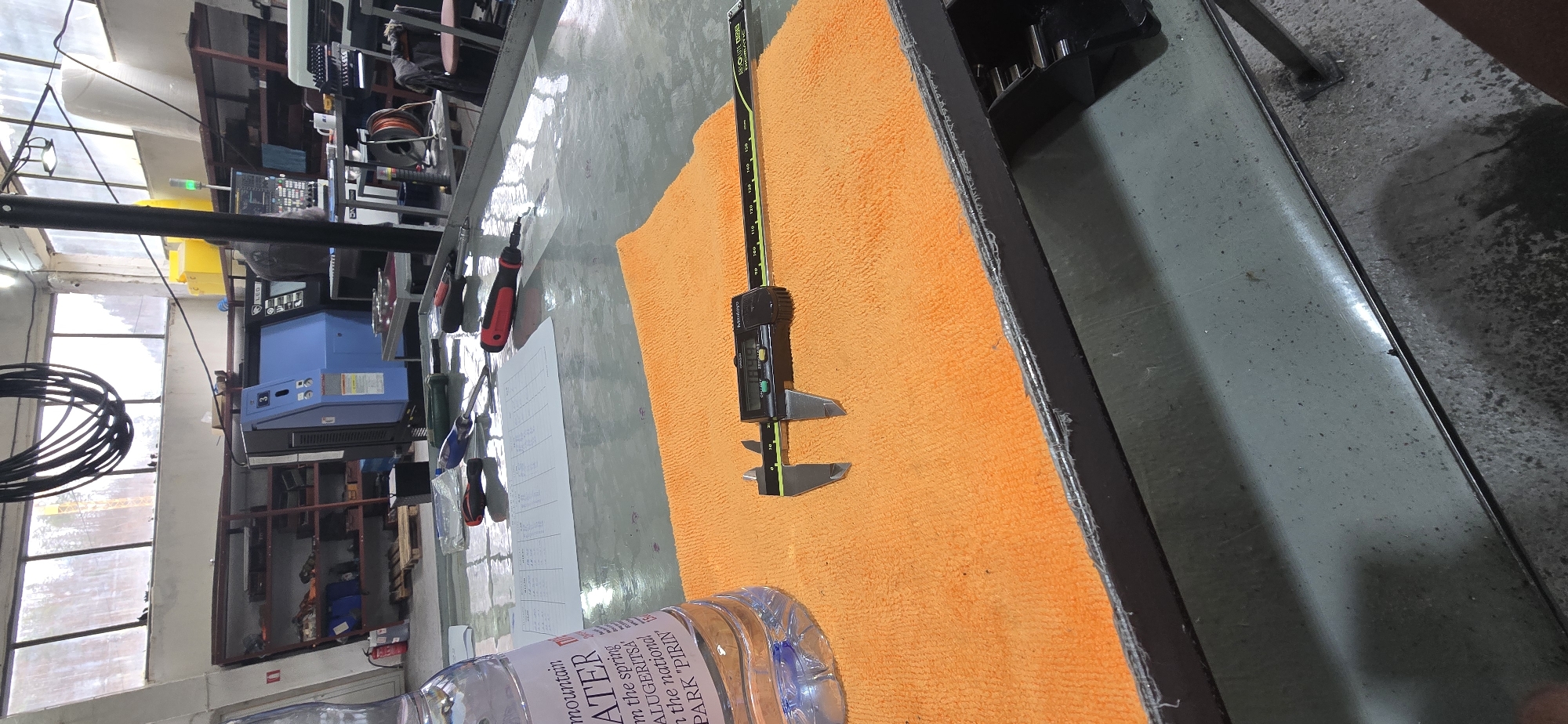 The scene depicts an industrial workshop in Madan, Bulgaria. In the foreground, a light-colored work table supports an orange microfiber cloth. A black and green Mitutoyo digital caliper, displaying "18.99," rests on the cloth. To the left, a partially visible plastic bottle of "mountain WATER" from "PIRIN" national park is present. A white sheet of paper with tabular data and several screwdrivers with red and green handles are also arranged on the table surface. In the midground, a blue CNC machine with a control panel and active monitor is visible. A person, seen from the back, is seated at a workstation next to the CNC machine, facing the monitor. Another metal table to the right holds various metal components or containers. A yellow plastic drum is located further back. Along the far wall, red metal shelving units are stocked with tools, parts, and supplies. A red fire extinguisher stands on the floor near the shelving, and wooden pallets are also visible. The background features large windows spanning the upper portion of the wall, revealing an exterior landscape of trees, possibly snow, and the distant structure of a crane. Black electrical cables are coiled and suspended from the ceiling. The workshop is illuminated by both natural light from the windows and overhead artificial lighting, casting reflections on the table surface. The floor is industrial concrete. No specific actions or interactions are clearly discernible, beyond the person at the workstation operating equipment.
