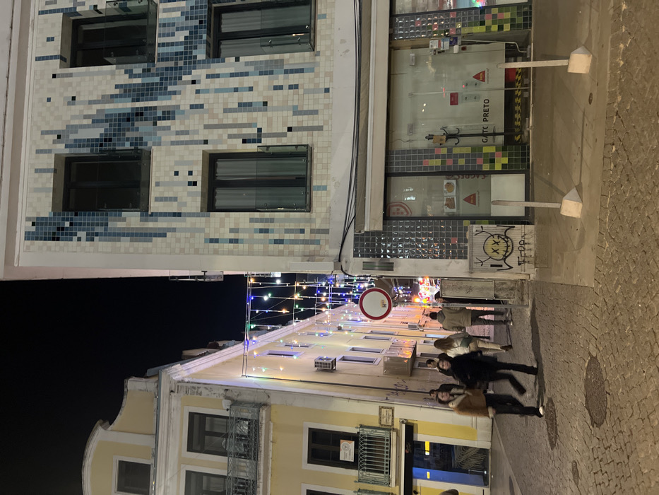 A street view at night showcases buildings with diverse architectural styles. On the left, a tall building features a tiled facade in blue and white hues, punctuated by four windows. Adjacent to it is a shopfront with a glass facade displaying the words "GATO PRETO." String lights crisscross the street, illuminating a group of people walking on the cobblestone pavement. The building on the right exhibits a yellow facade with a balcony and windows. A circular red and white traffic sign is visible in the distance.