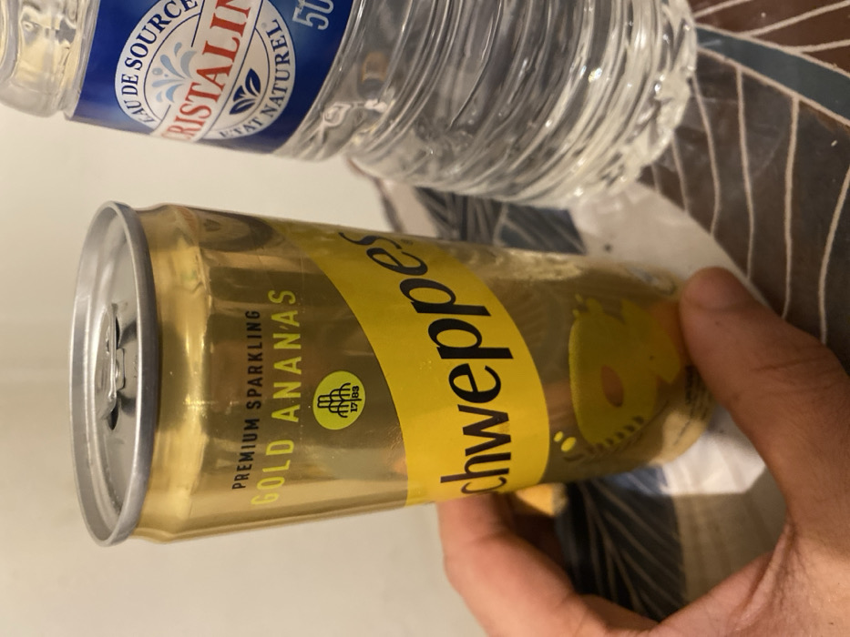 A gold Schweppes Gold Ananas can is held in a hand, positioned diagonally. To the left, a partially visible Cristaline water bottle sits on a surface featuring a patterned design. The Schweppes can prominently displays the brand name in yellow, along with the words "Premium Sparkling Gold Ananas." The background is a blend of light and shadowed areas.