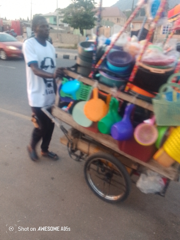 A man wearing a white t-shirt and dark pants pushes a cart laden with colorful plastic wares. The cart is overflowing with buckets, basins, and other household items, arranged haphazardly. The vendor walks along the side of a road, a car passing in the background. The scene is captured in daylight, possibly early morning or late afternoon, indicated by the soft light. A mountain is visible in the background.