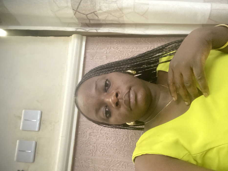 A woman with braided hair, gold hoop earrings, and a gold necklace is seen wearing a bright yellow top. She is lying down and looking at the camera. Behind her is a wall with light pink patterned wallpaper, a white door frame, and two white light switches. The upper left corner shows a glimpse of a curtain with geometric patterns.