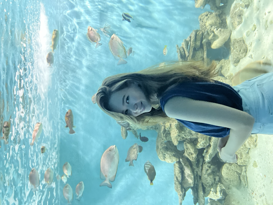 An East Asian woman, appearing to be in her twenties or thirties, is positioned in the foreground, smiling and looking directly at the camera, with her body slightly turned to the viewer's right. She has long, light brown hair, a fair complexion, and is wearing a dark blue sleeveless top and light-colored bottom wear. Her arms are bent, with hands clasped or resting in front of her. The background consists entirely of a large, clear aquarium tank filled with bright blue water, illuminated from above to show surface ripples. Numerous marine fish of various sizes and species are swimming throughout the tank, including several silvery-pinkish fish, mottled brown pufferfish-like fish, and smaller striped and yellow-finned fish. Artificial rock formations and sandy substrate are visible along the bottom of the tank. This scene is located within the aquarium at VinWonders Nha Trang in Nha Trang, Vietnam.