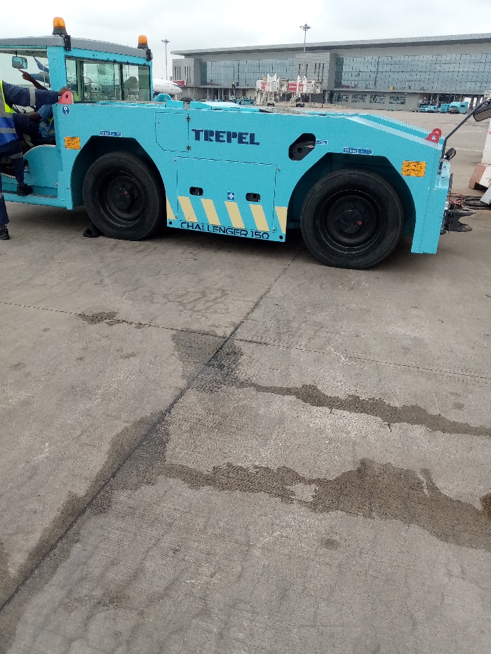 The image displays an airport tarmac scene in the city of Unknown, Nigeria. A light blue Trepel Challenger 150 aircraft pushback tractor, bearing "TREPEL" in dark blue lettering and "CHALLENGER 150" with yellow and blue striped hazard markings, occupies the central and mid-ground. The tractor has four visible large black tires and an operator's cabin on the left side, equipped with two orange rotating beacons on its roof. A partially visible individual, dressed in a blue uniform and a yellow high-visibility vest, is positioned near the left side of the tractor's cabin. The concrete tarmac in the foreground exhibits multiple dark, irregular liquid stains. In the background, a modern airport terminal building with large glass panels and multiple jet bridges is visible, along with parts of parked aircraft, all under an overcast sky.