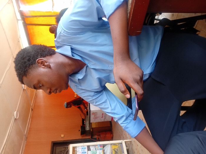 An adult male of African descent is depicted in profile, seated indoors at a dark brown table. He wears a light blue, long-sleeved collared shirt and dark trousers, holding a dark-colored smartphone in his left hand. His gaze is directed to the left. The setting is an eatery, characterized by orange-brown vertically paneled walls and a light-colored ceiling with circular flush-mount light fixtures. In the background to the left, a white shelving unit holds packaged goods, adjacent to a red gas cylinder. Further left, a person in dark clothing with a red head covering is actively cooking at a stovetop on a white counter, near a display box labeled "Arra for life". Orange curtains are visible on the right side of the background. Another partially visible individual is present further in the background to the right. The overall environment is consistent with a commercial eatery in Lagos, Nigeria.