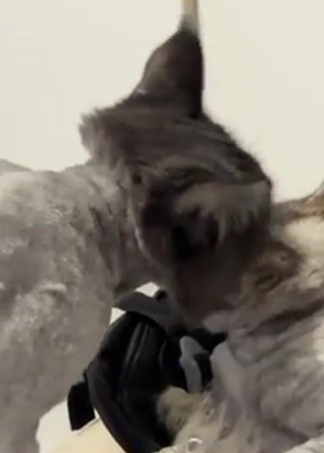 Two shaved cats, one predominantly grey and the other mottled with stripes, are interacting closely